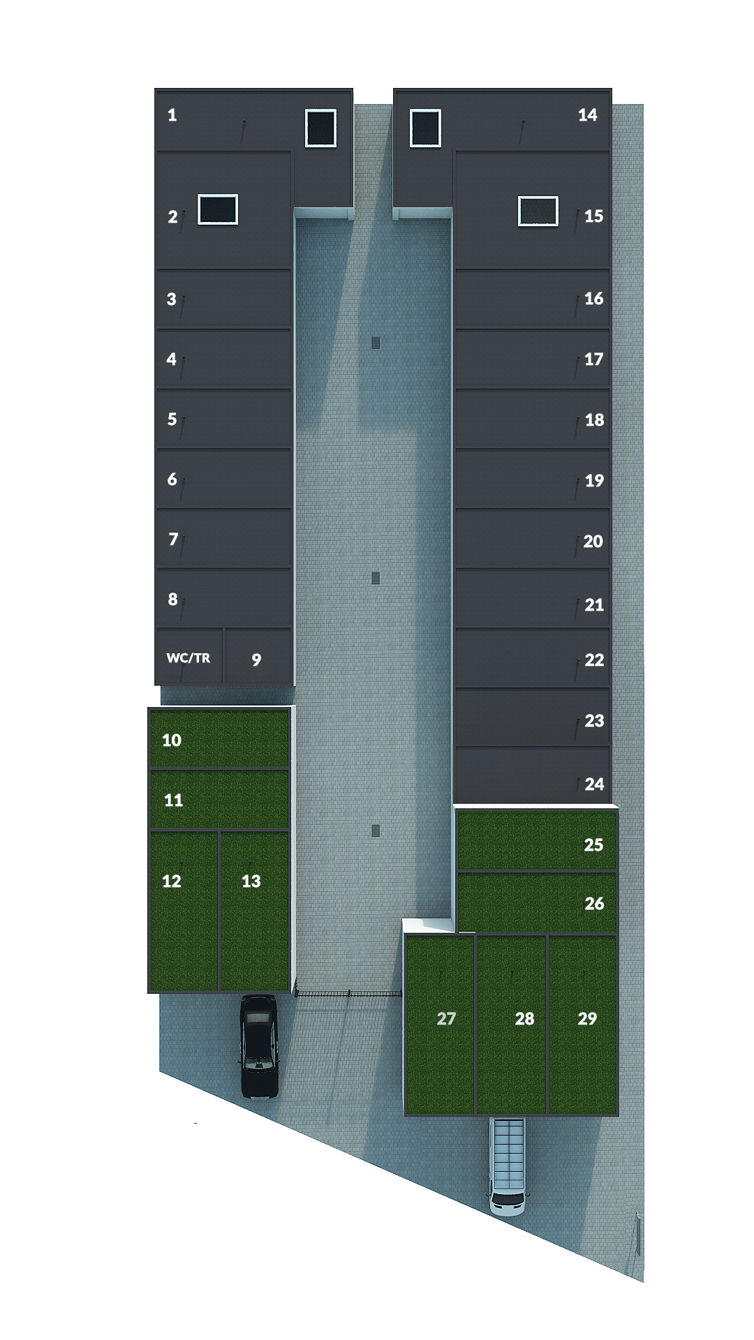 Type PRO Extra lang, hoog en breed met verdieping en eigen oprit: Deze PRO units hebben een verdieping en een eigen oprit. De unit op de begane grond is 3,5 meter hoog waardoor de inrijhoogte bijna 3 meter is. De bovenverdieping is 2,5 meter hoog. Om boven te komen, wordt er een houten molenaarstrap geïnstalleerd. De bovenste verdieping is voorzien van een draai-, kiepraam van 100x80cm met isolatieglas.